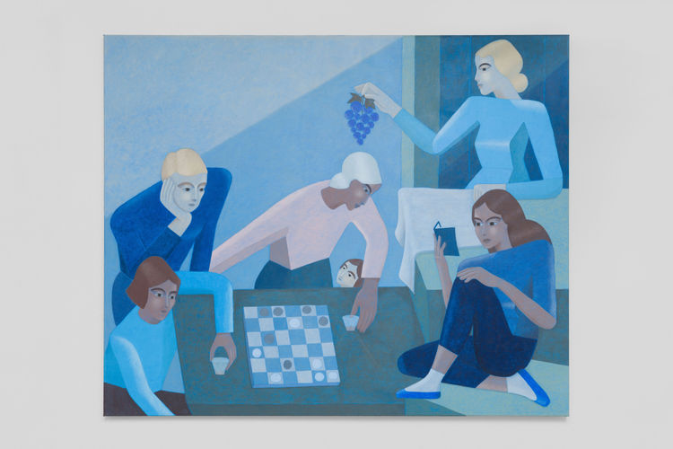 Since Pashaei’s last solo with us, she has sorted through old family photos and videos and stories—some moments depicted in these paintings—and she started to read more about Iranian history. She was intrigued specifically by the Qajar period, in which its art portrayed the ideal with stylized and flattened perspective. It depicted an unattainable but ideal life. Despite the frequent criticism of the period for its political instability and decline, it remains notable for artistic and cultural contributions, especially the flourishing of portraiture. In her practice she uses these references as a foundation to develop an iconography that speaks to the permanence of art while also acknowledging the impermanence of tradition, especially when it is lost through displacement and its repercussions. Aside from the re-framing of this idealized image, the palette of these works reflects Pashaei’s color studies generally focused on Iranian art and architecture.