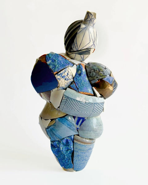 Chase Travaille creates his works from the scraps of other artists’ pieces, inspired by the surrealist game “Exquisite Corpse.” (A game that involves additions by a succession of artists to a work of art). Travaille uses the Greek amphora shape to further subvert the meaning behind the works. Historically, in ancient Greece, the amphora was used as a grave marker. By synthesizing these two vastly different references, from ancient Grecian pottery to Surrealist games, Travaille’s work plays with traditional ideas around beauty, conservation, value, authorship, and identity. Importantly, his work invites in—the performative/assemblage quality of the work and the use of shards from different artists from diverse cultural backgrounds mirrors society’s complexities and the multifaceted nature of identity and ownership.