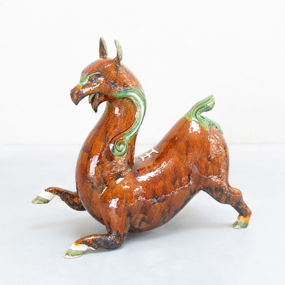 Then there are three new sculptural works in the exhibition all made during a residency this summer at the European Ceramic Workcentre in the Netherlands. These works are inspired in part by Tang Dynasty (618 to 906 A.D) stories and aesthetics; more precisely, a style of glazing particular to that time-period, Sancai ‘三彩.’ Up until that point in China and East Asia ceramics were predominantly glazed in a singular color. In the Tang Dynastic period, ochres, ambers, greens, blues, purples, and whites would appear together in varying combinations. Made from technology introduced from the West during Silk Road trade, the style is also known as tri-color glaze. The luscious surfaces of Sancai guided Wang’s research in glaze formulation and application, evoking that period in a contemporary way. Besides delving into the materiality and the process of Sancai, what interested Wang was also Sancai’s role in the construction of Chinese pride. As always, every detail and reference in Wang’s work is thought-through and beyond intentional. The intermingling of cultures, of ancient and contemporary, of fantasy and reality, and of family and history is totemic within Wang’s oeuvre.
